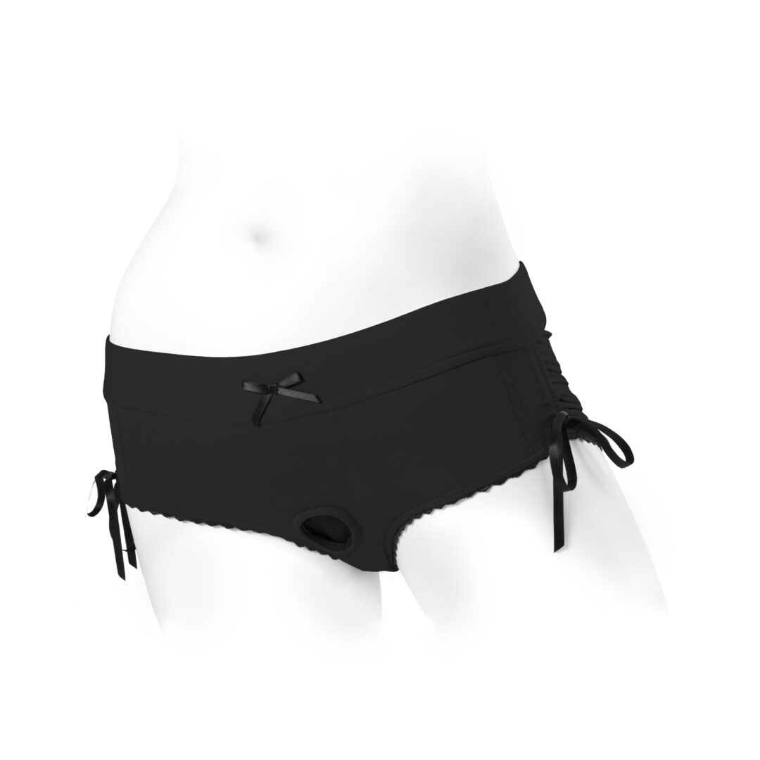 Two looks in one: a tug and twist of the ribbons transforms booty shorts into high‐cut panties